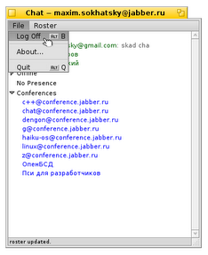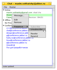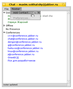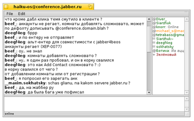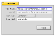 Also by context menu you can Remove or Edit roster contacts titles and room nickname if that feature is enabled by server. Remember that Haiku Chat can store conferences in roster on server as persistant contacts if server does not support Private XML Storage. If server does — Haiku Chat will store confereces there in Psi compatible XML format. So you could access them from other client.