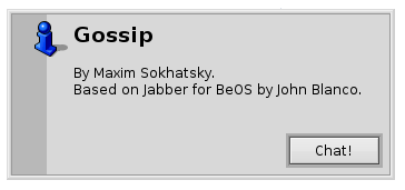 Haiku Chat is tiny, about 300KB XMPP client. It supports core XMPP protocol, multi-user chat, Google accounts, Psi bookmarks, In-band registration and other features. It is written for Haiku, free open-source operating system inspired by BeOS. Haiku Chat is simplest and smallest client that supports XMPP Advanced Client 2009 profile.